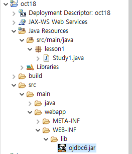 - 연결할때 자바쪽에서 필요한 클래스 및 인터페이스가 준비되어 있고, 오라클에서는 jdbc드라이버가 필요하다