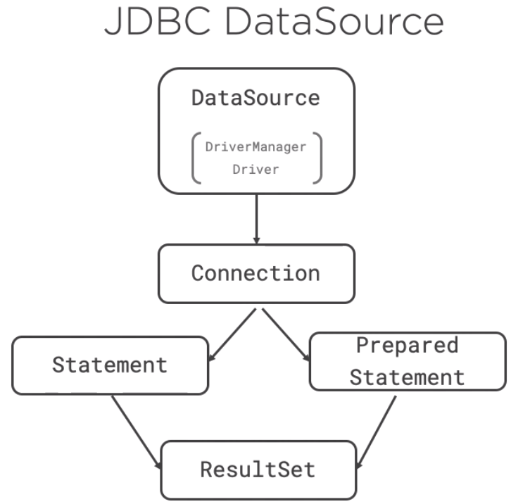 - 위에서 언급한 4가지 객체들을 통한 데이터베이스 연동 과정은 다음과 같다