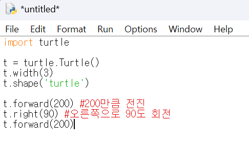 * 이때 주의점 `import turtle`을 사용할때 turtle이라는 이름이 이미 존재하여 충돌할 수 있으니 해당 이름은 피할 것