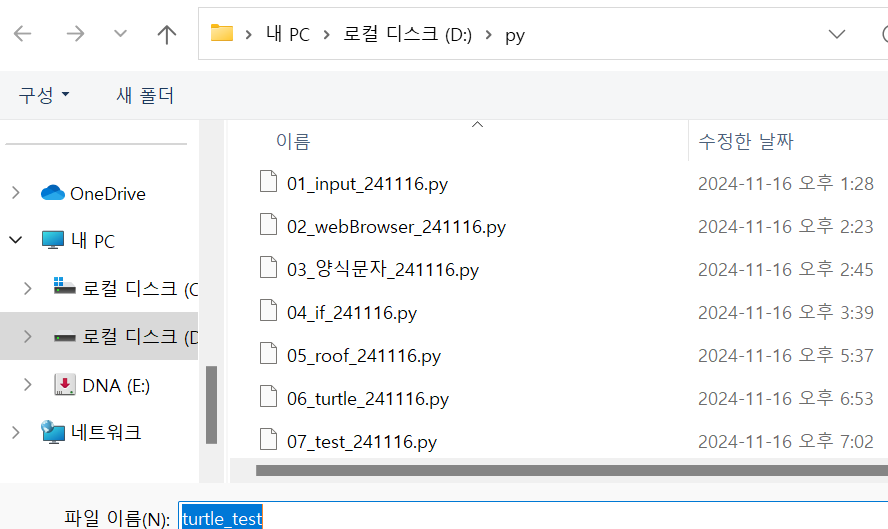 - 파이썬 코드 파일을 실행하기 위해서는 저장을 해야한다