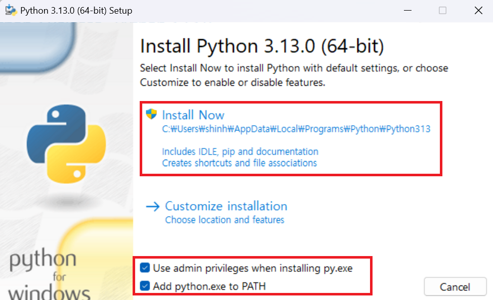 - 특히 Add python.exe to PATH 체크를 안하면 환경변수를 따로 설정해줘야 하기 때문에 꼭 해주는것이 좋다.