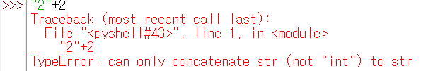 - "123" + 4 의 계산값으로 "1234" 문자열이 나오는 자바와 자바스크립트와는 다르게 파이썬은 안됨