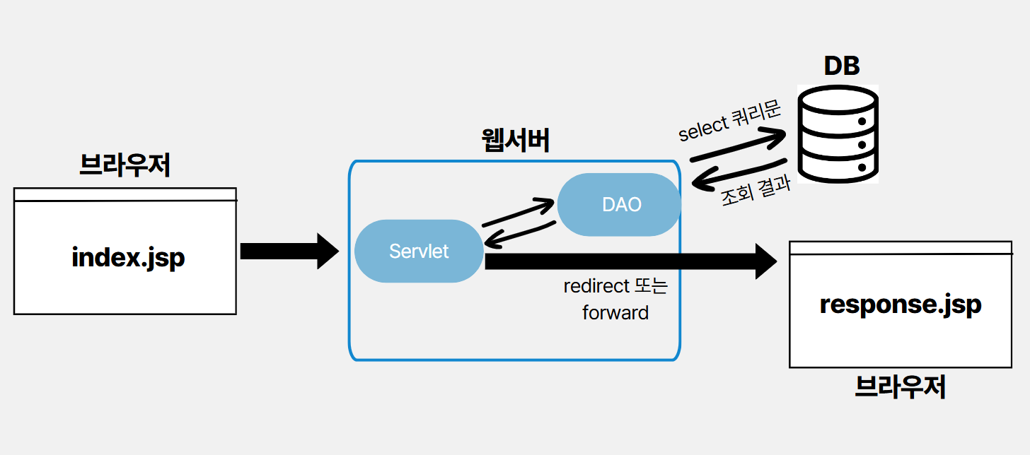 - 클라이언트에서 전송한 요청을 서블릿이 받아서 데이터를 처리한 후 결과를 JSP로 전달한다.
